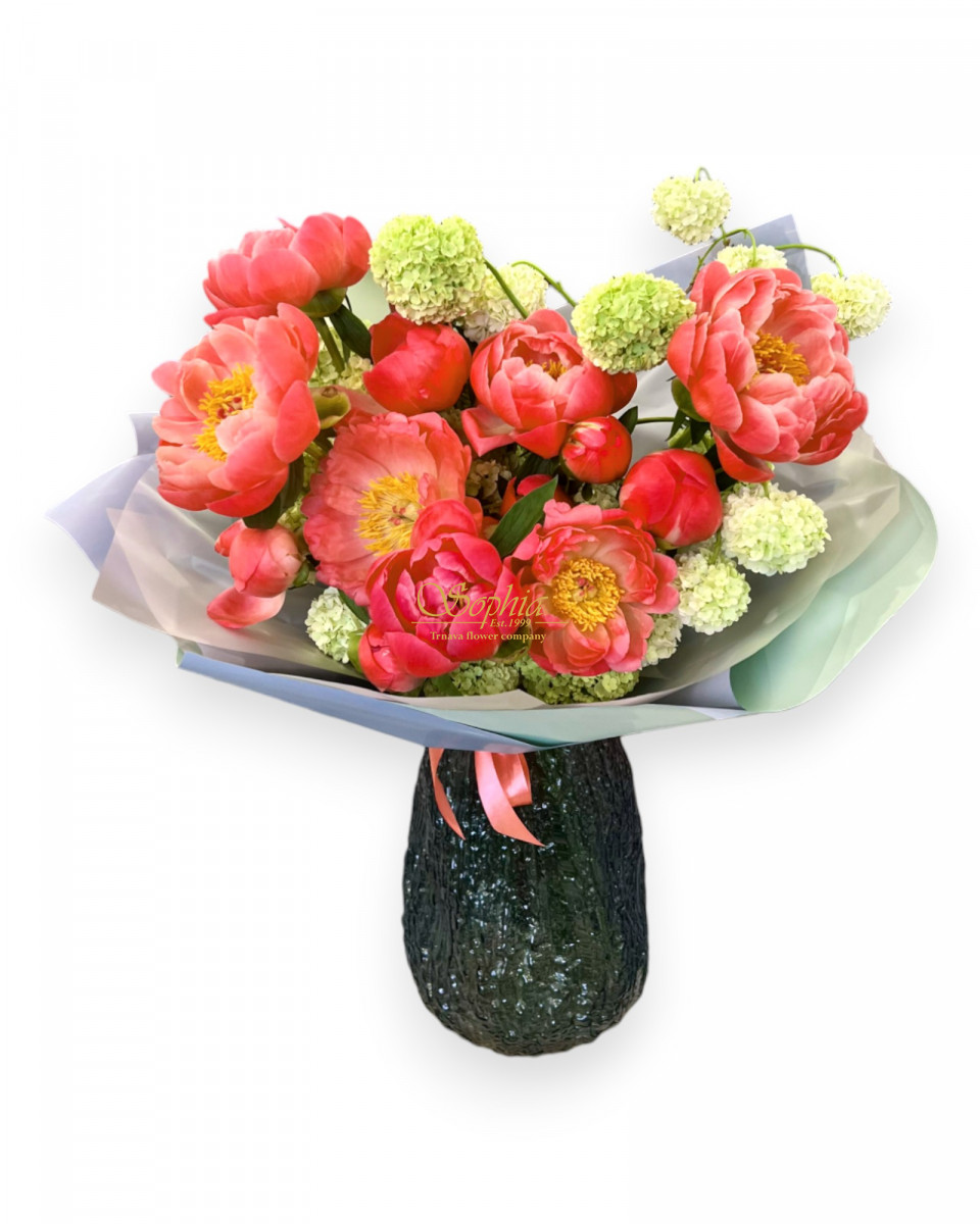 Táto kytica je ako záblesk slnečného dňa – plná energie a farieb. Koralové pivonky v kontraste so svetlozelenou kalinou vytvárajú harmonickú kompozíciu, ktorá osloví srdce aj oči. (Na obrázku je zachytená Veľká kytica)